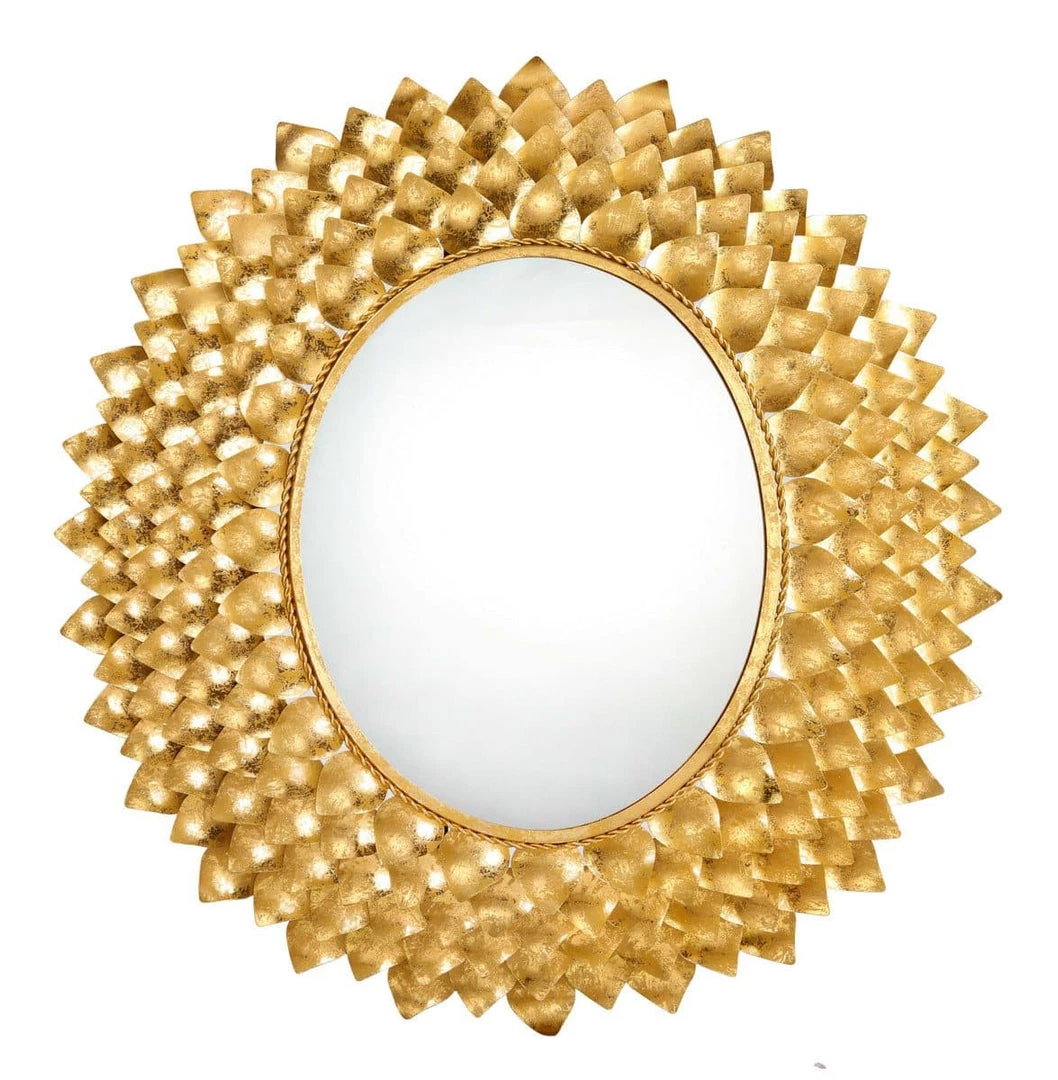 This mirror’s exceptional hand hammered frame boasts a golden finish and will add a unique scultural texture to any space.