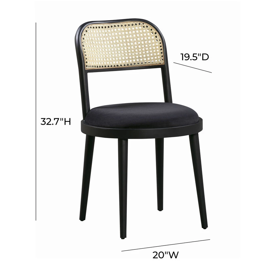 Upgrade your dining experience with the Brava Cane Dining Chair. A round, black velvet upholstered contrasts beautifully with its woven white cane back to create the perfect blend of comfort and style.