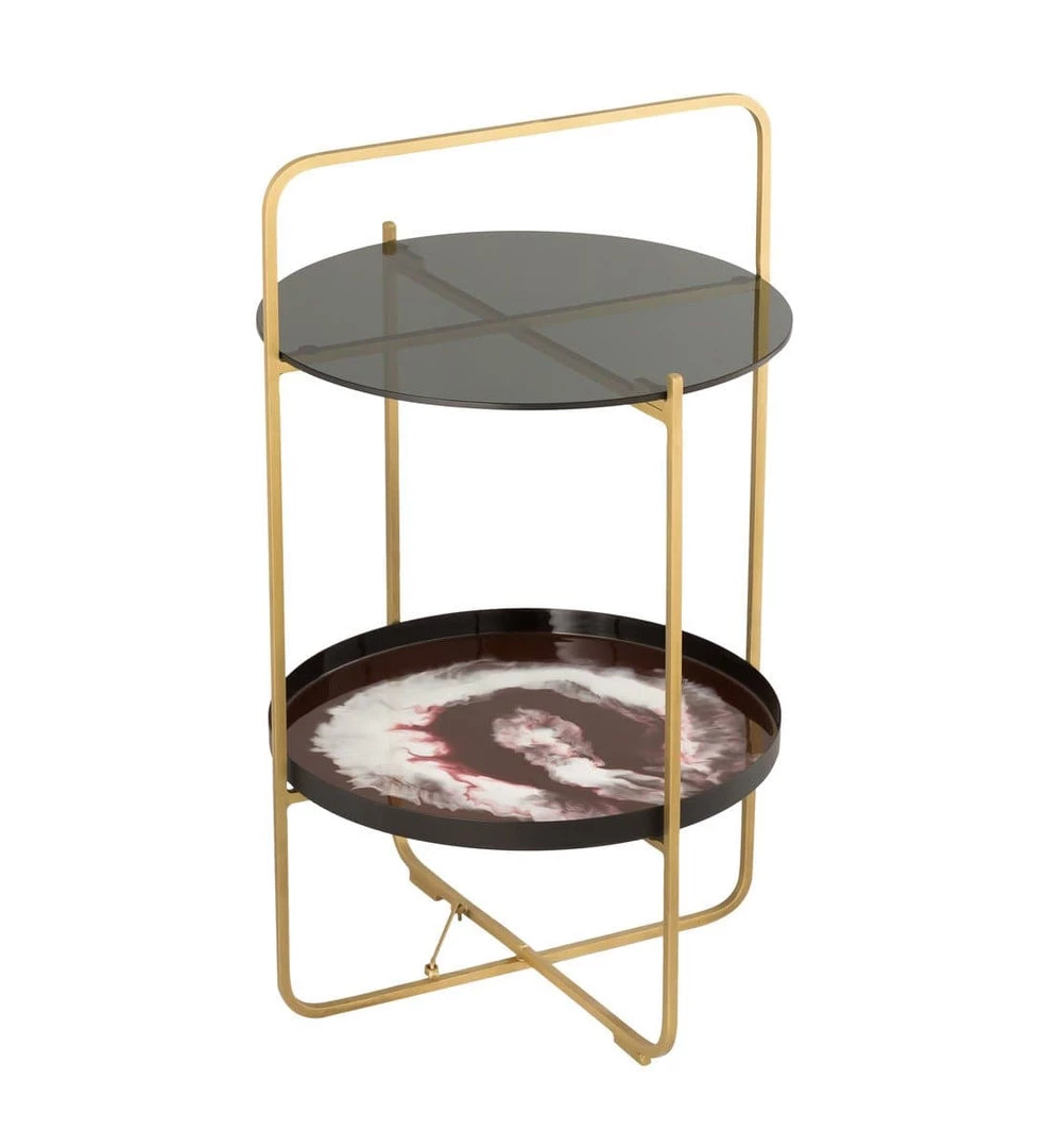 Crafted from gold-finished iron and flaunting a unique enamel tray and glass top, this side table is offered in two color options to match your fabulous style.