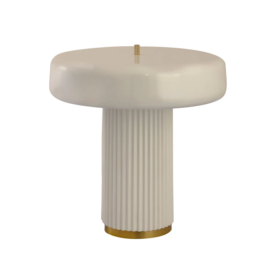 The unique shape of the Kamryn Table Lamp will light up your room with its distinct glow. Crafted from iron, this lamp features a dome-like lamp shape and a stunning cylindrical base with brass accents. Available in Cream or Olive and Grey to match your design style.