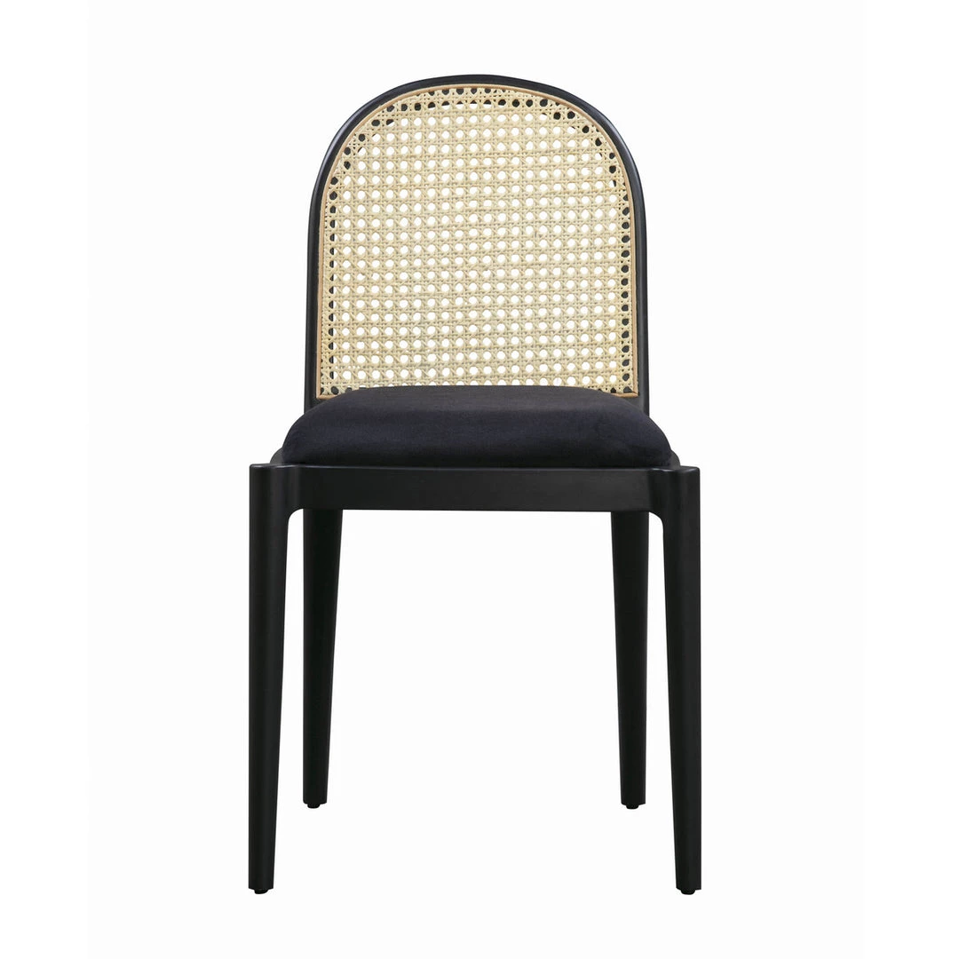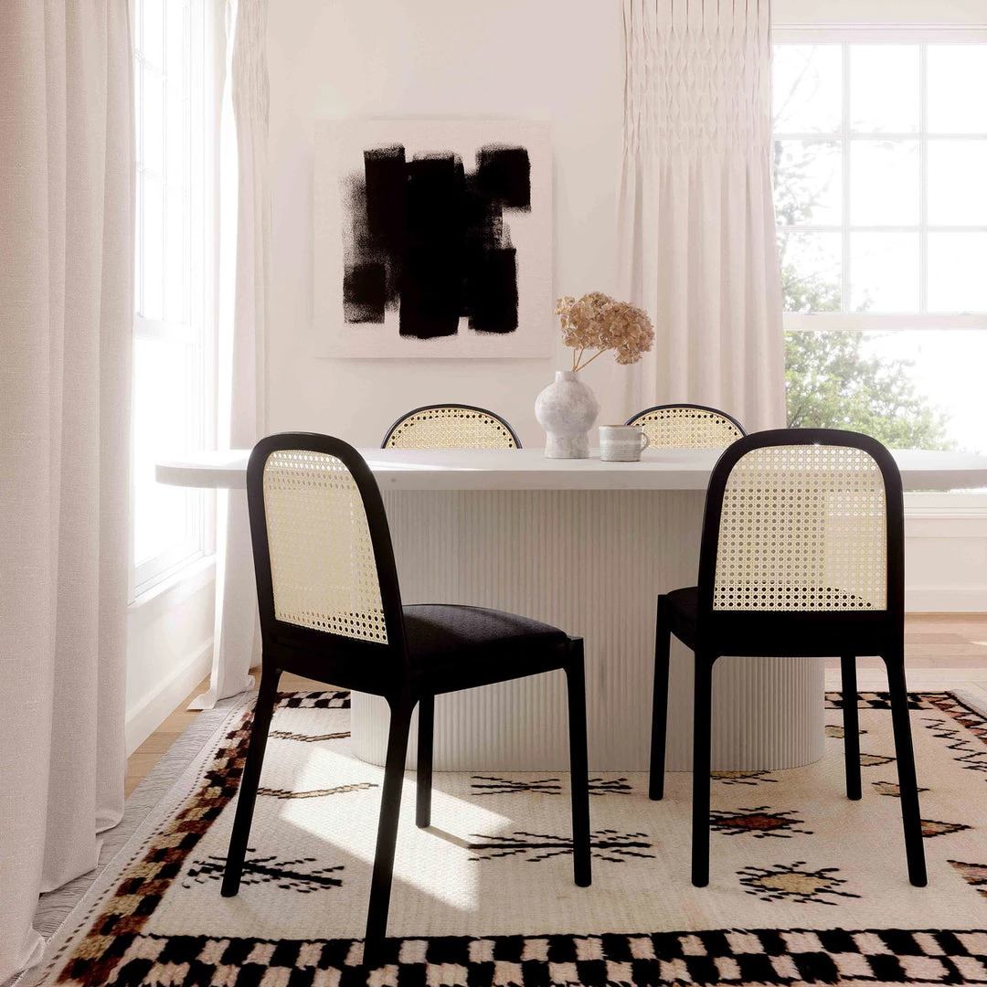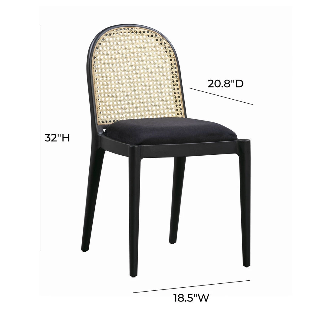 - Upgrade your dining experience with the Kora Cane Dining Chair. Its plush velvet upholstered seat contrasts beautifully with the white cane back to create the perfect blend of comfort and style.