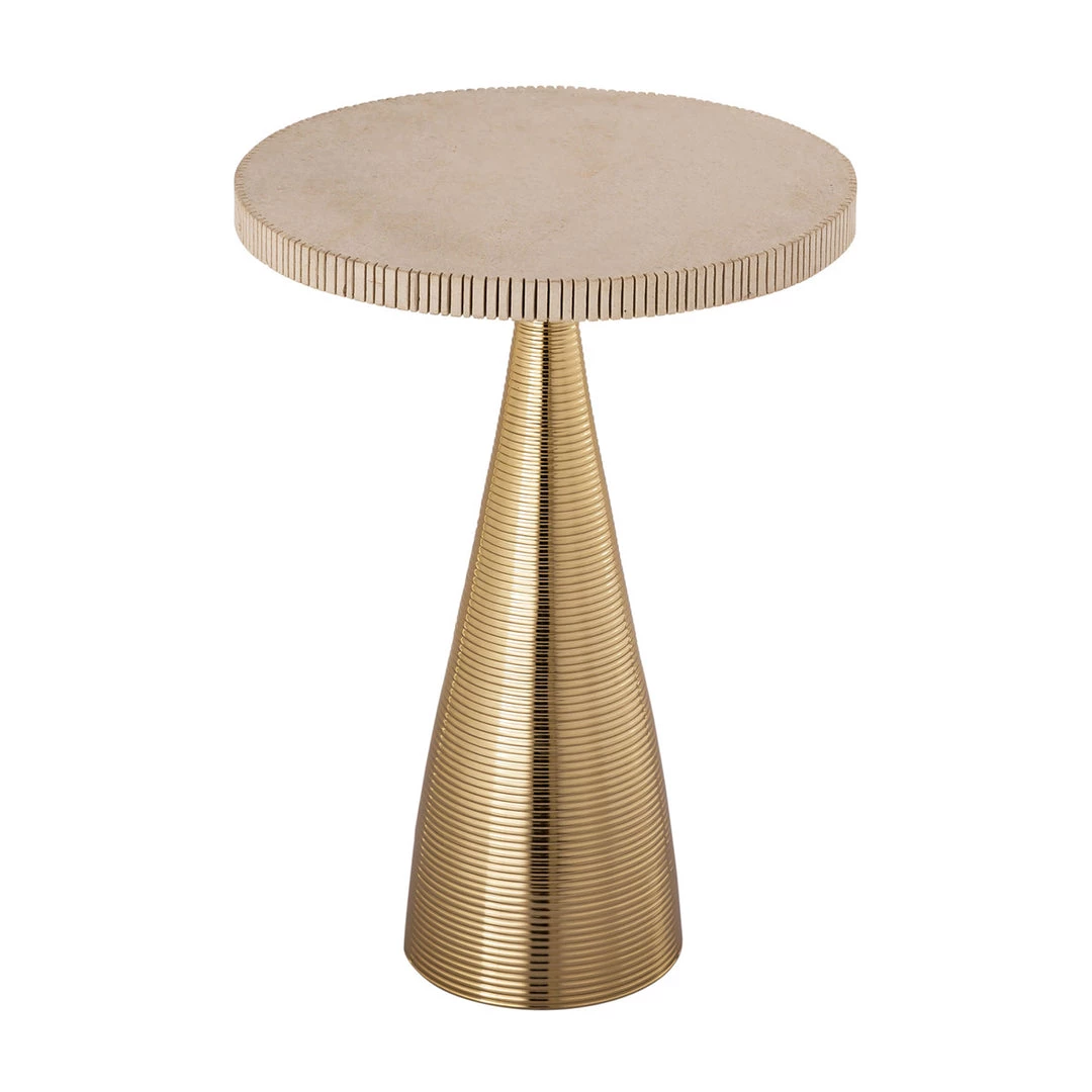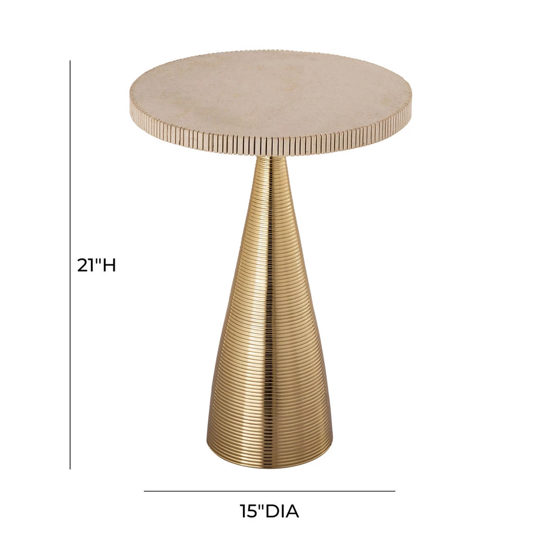 Featuring soft tones and light accents, the Celeste table will fit in any space. The gold, ribbed base complements the pale satin top, rimmed in the same ribbed design and creating a perfectly-balanced accent piece.