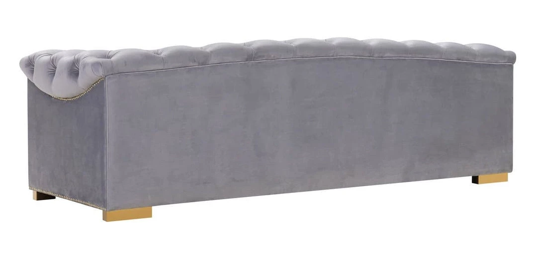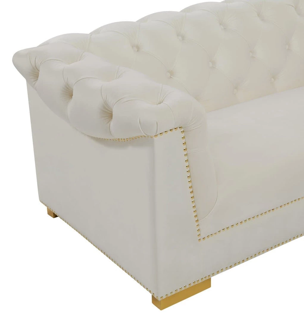 Offering a fresh and modern spin to a classic style, Inspire Me Home Decor and TOV proudly introduce the Farah sofa. With its luscious velvet upholstery, unique tufted design on its rolled arms and hand applied gold nailhead trim, it will be the focal point of your living space.