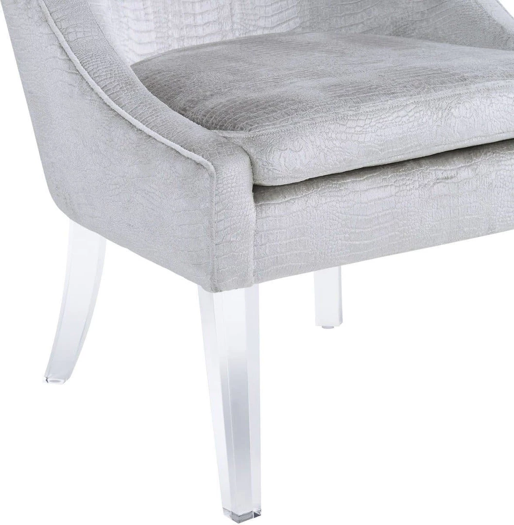 The classy yet stylish look of our Myra chair is tapered to perfection. The sumptuous soft velvet upholstery/shiny silver croc and tall Lucite legs provide subtle elegance that will enhance the style of any space.