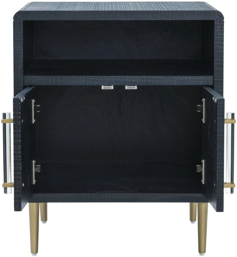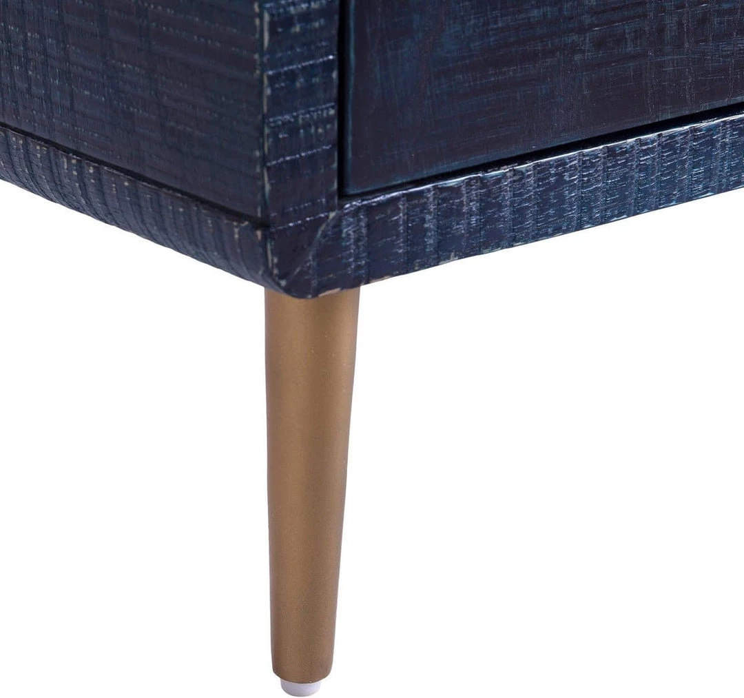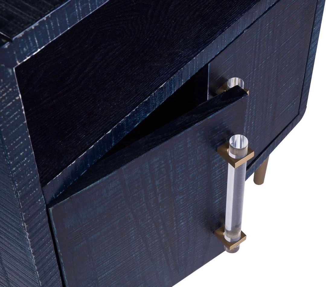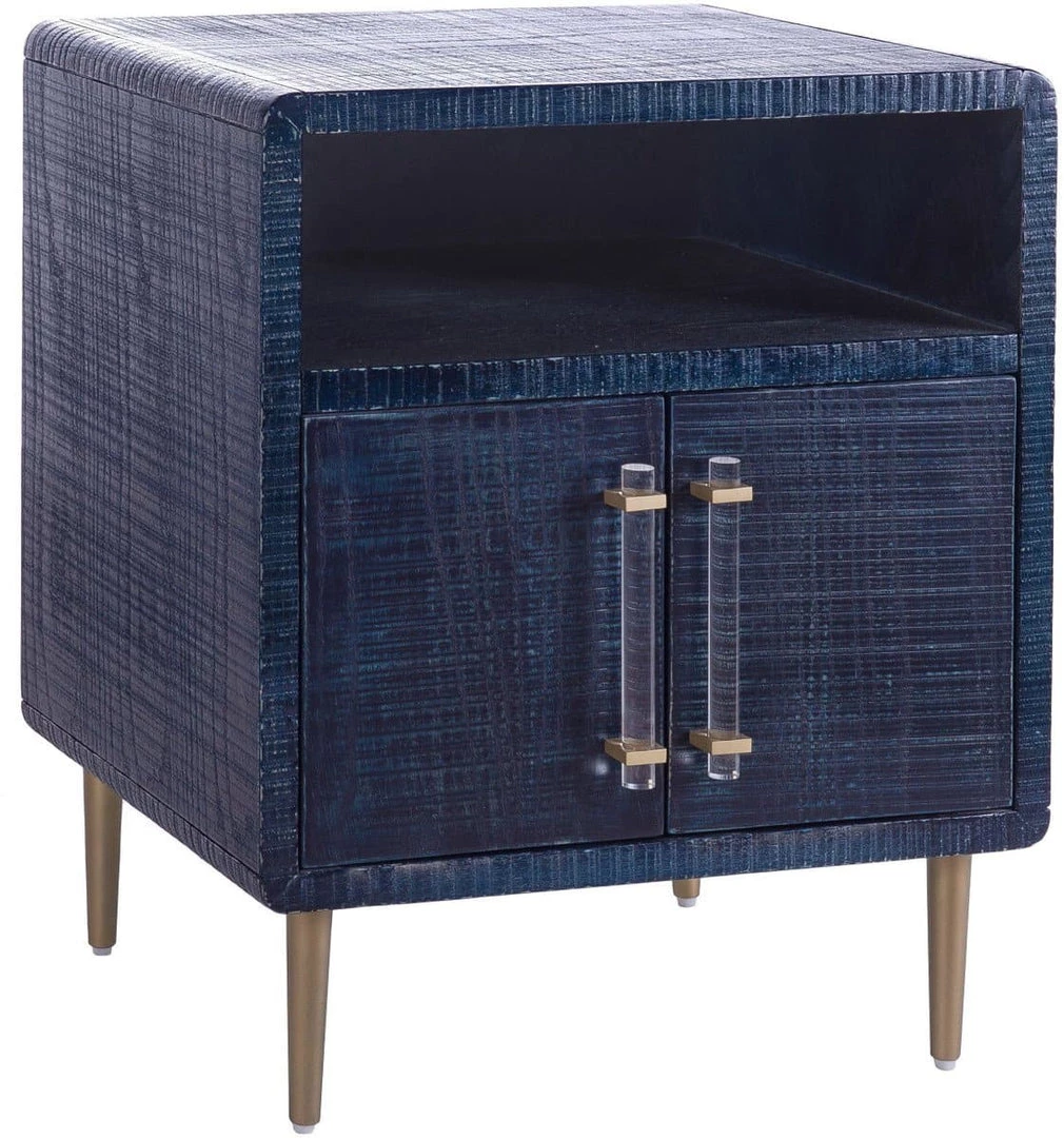 The Marco side table is the finishing touch to your bedroom. Boasting a stunning textured indigo colored finish, lucite handles, and brass legs, this luxurious piece adds both style and color. The two self-closing doors and open shelf assure that all your essentials are just an arms reach away.