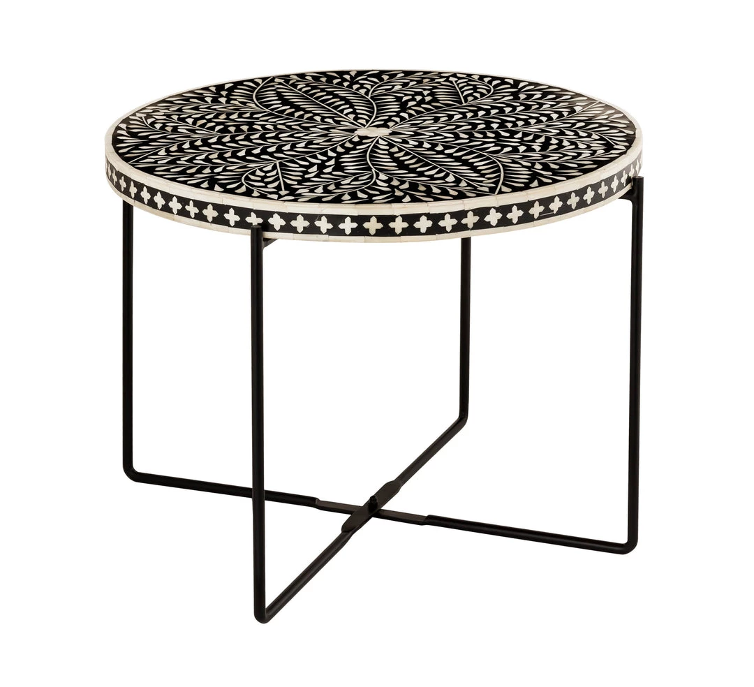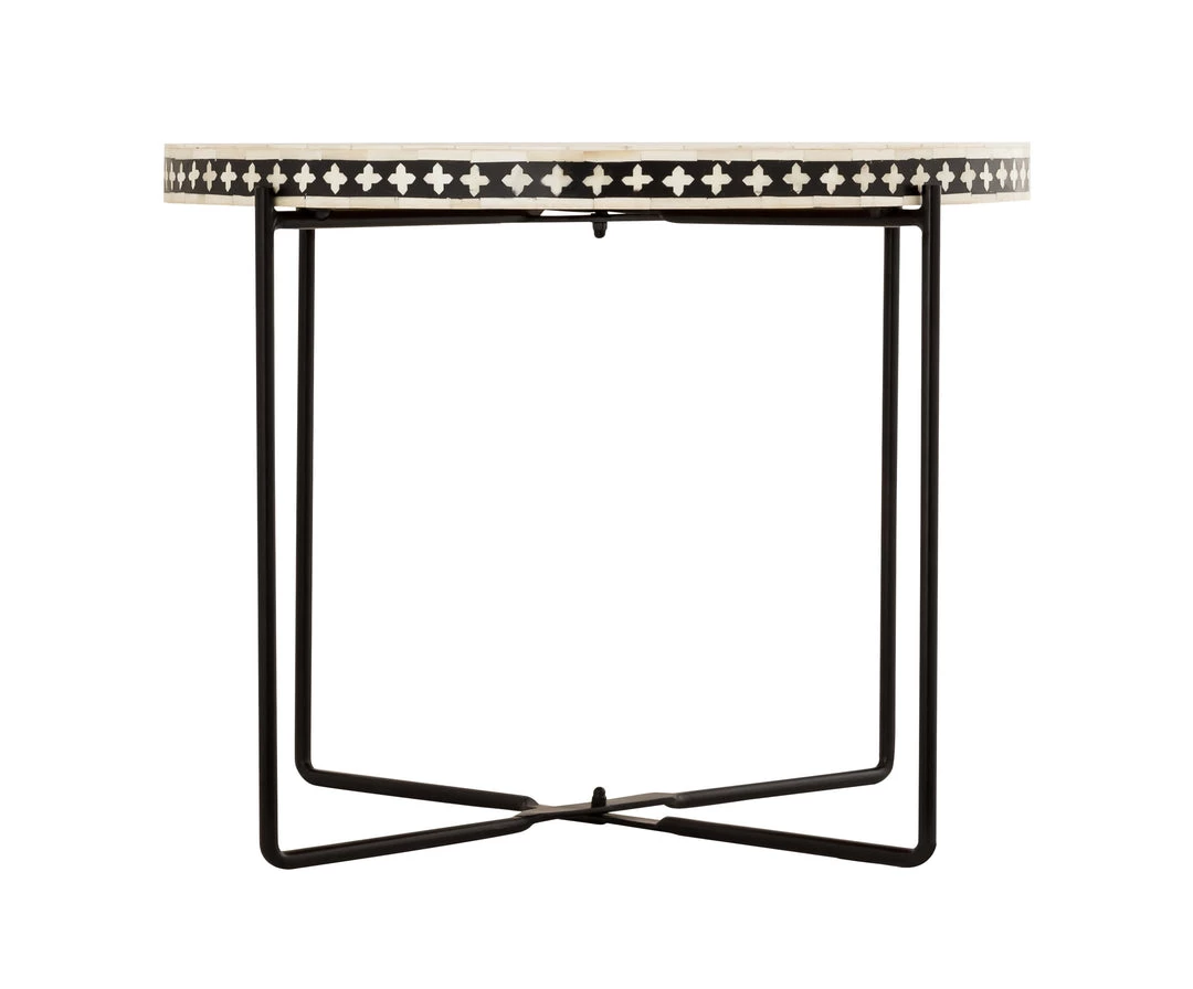 Handcrafted bone-inlay mosaics give this otherwise simple occasional table an undeniable sense of luxury. Its foldable, yet sturdy base offers convenience and minimalist design.