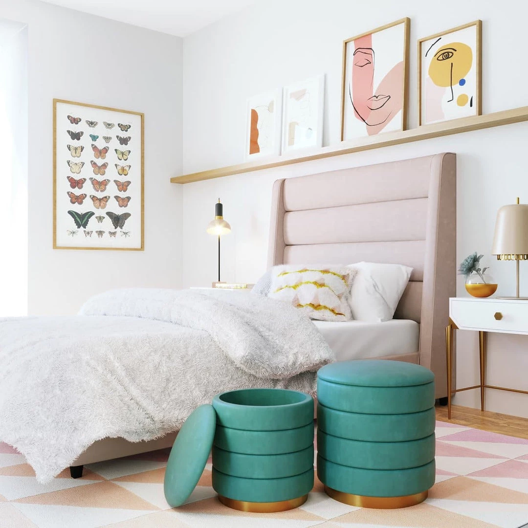 Glamorous and functional, the Nora ottoman offers stylish design and ample storage space. Featuring channel tufting, plush velvet upholstery and a gold base, itβll add a burst of fresh color to your space. Set includes two ottomans and is available in two colors.