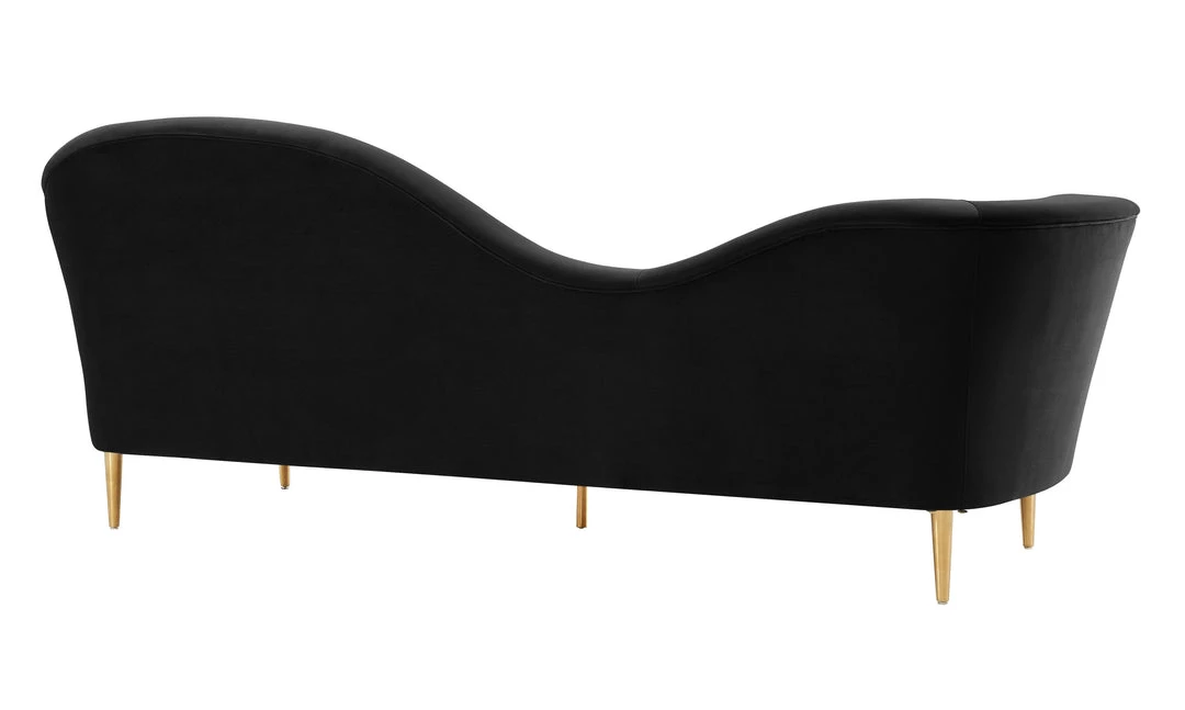 Hollywood glam is beautifully defined with the Plato velvet sofa. Its sloping silhouette, gold legs and luxurious upholstery, make this sofa a true statement piece. Featured in multiple color options.