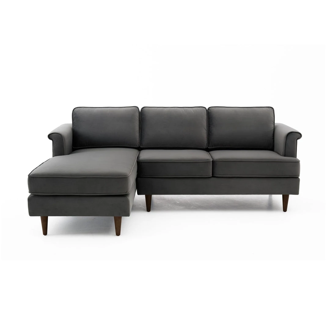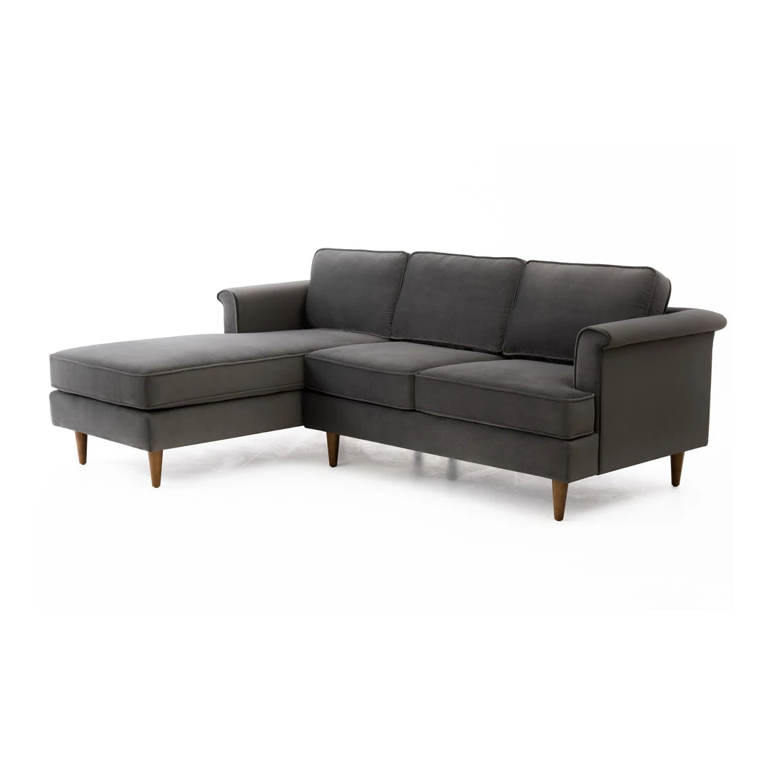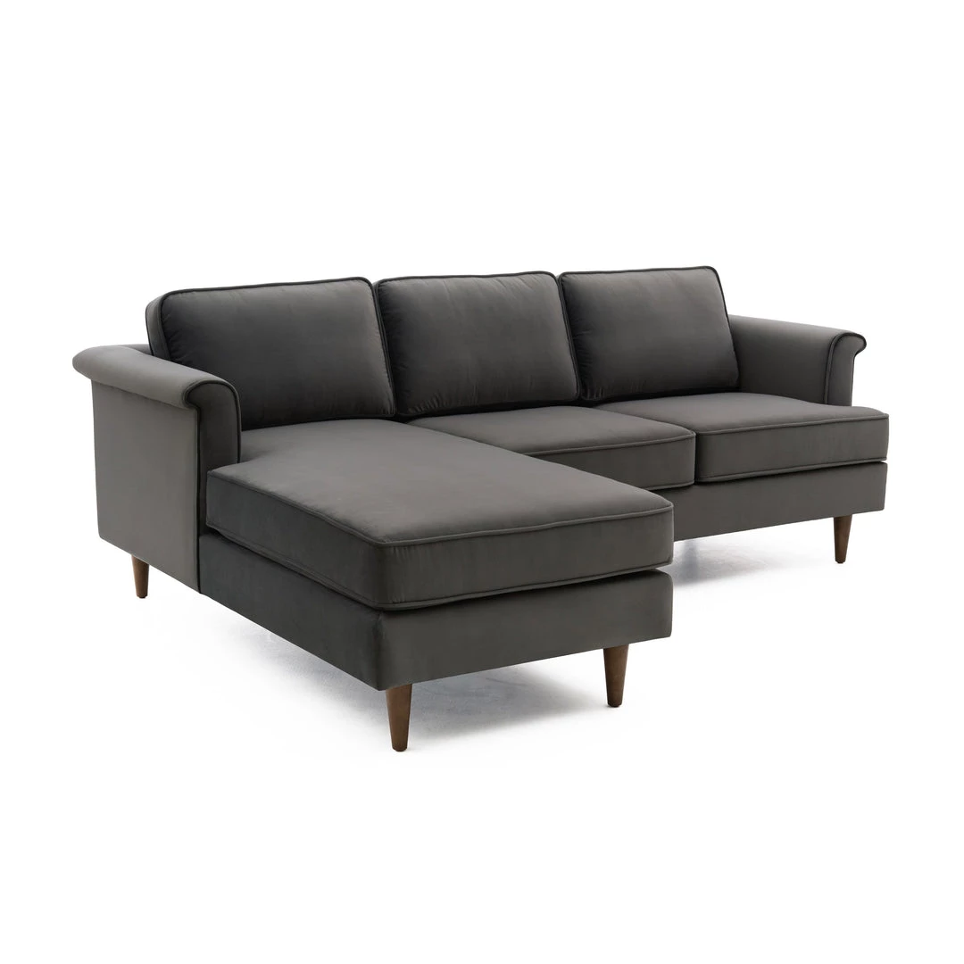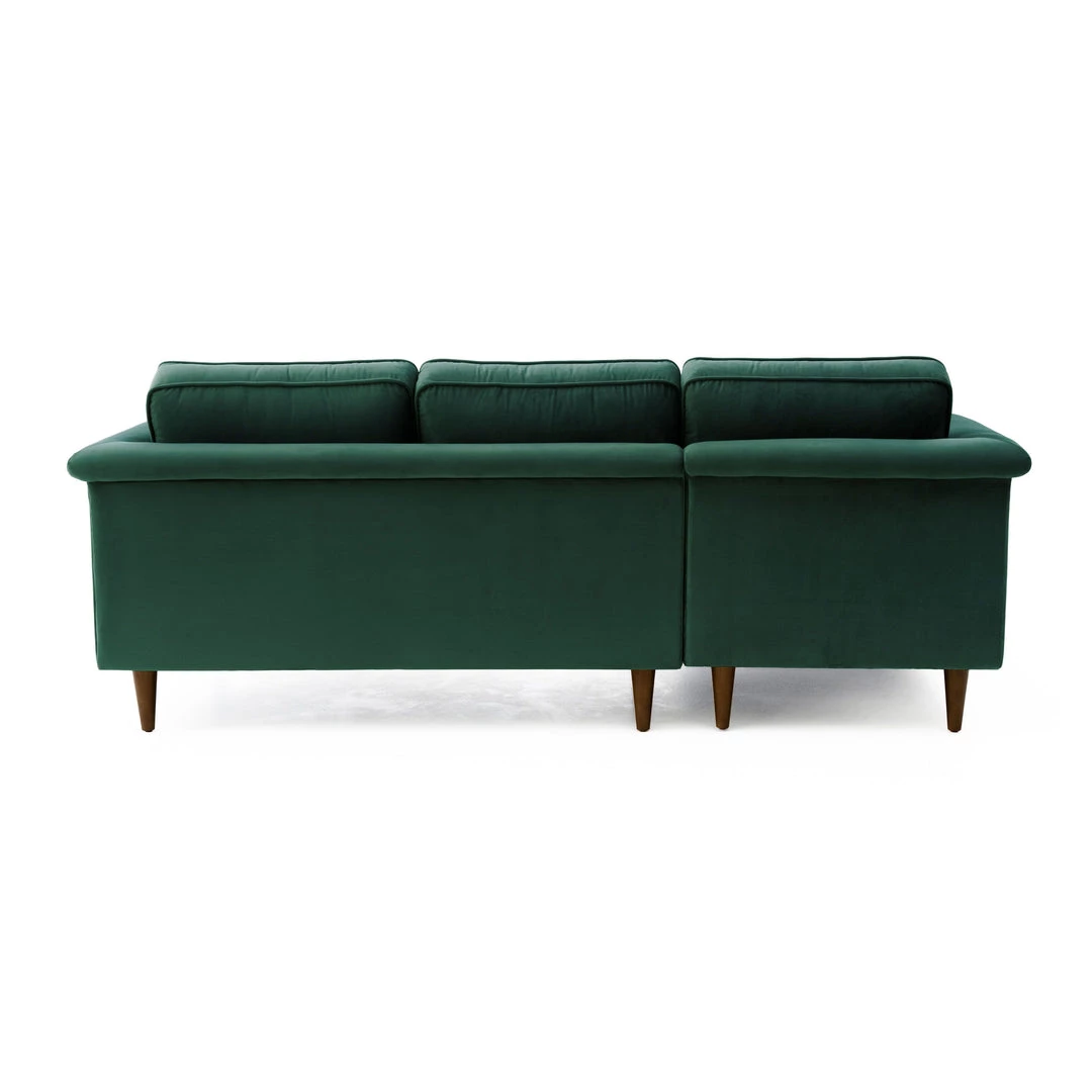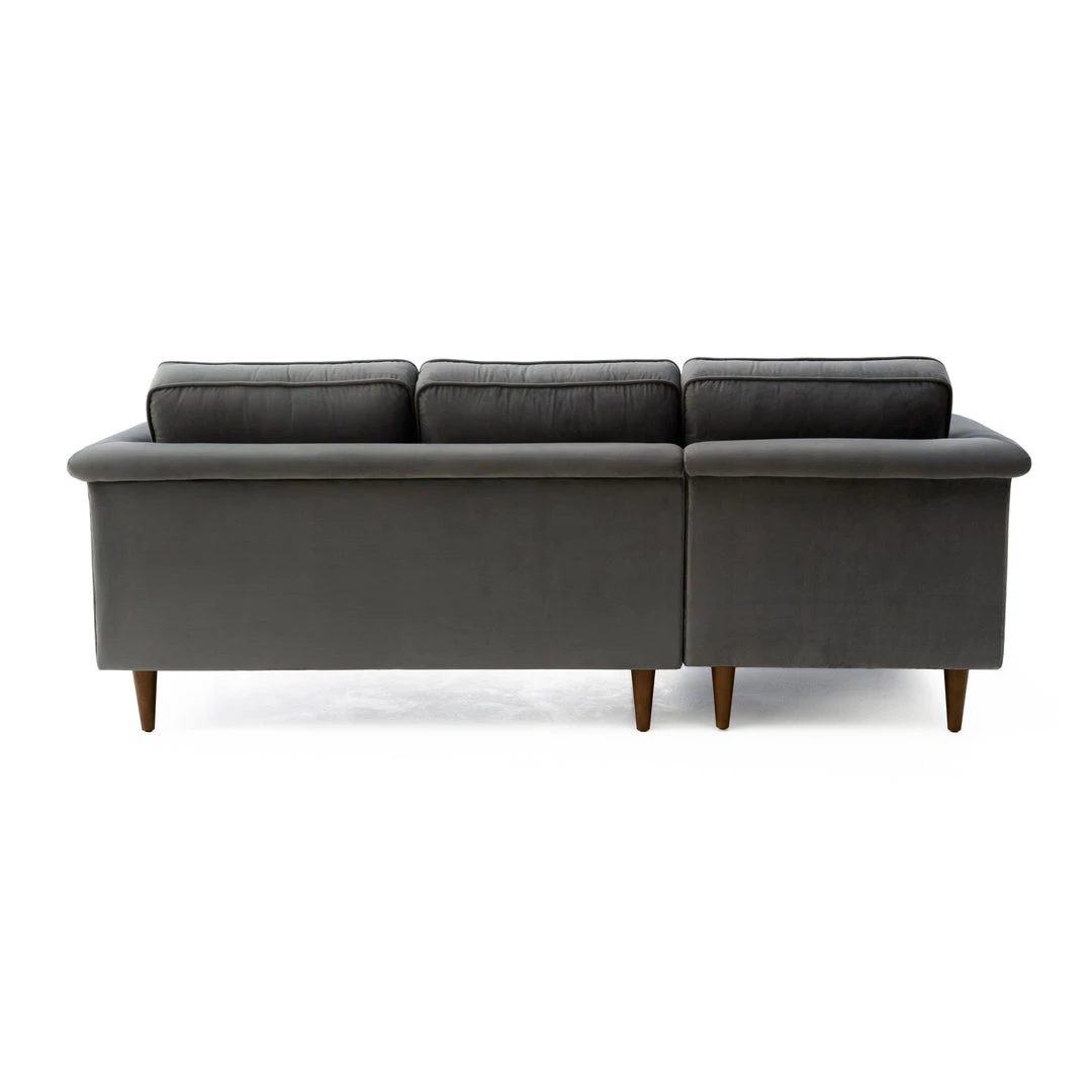 Mid-century modern is a classic design and the Porter sectional reinforces its allure. It offers timelessness and comfort with its removable cushions, sumptuous velvet upholstery, sturdy birch wood frame, and elegant rolled arms. This splendid sectional is available in grey or forest green options and either RAF or LAF configuration.