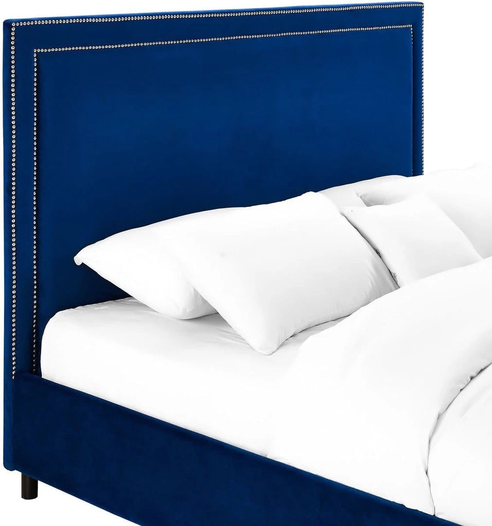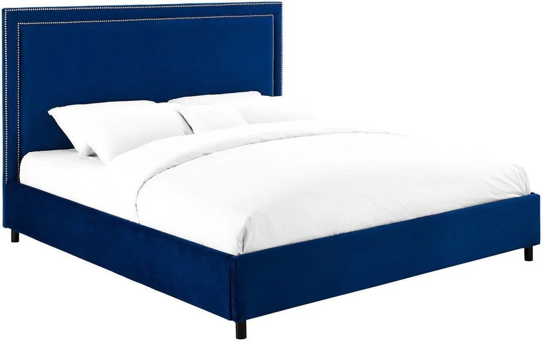 We know youβll fall in love with our polished Reed bed. A clean-lined silhouette, upholstered in an opulent navy velvet, with bold hand applied nail head accents that will dazzle a room like no other. Itβs time to bring glam to your bedroom. Slats included, no box spring required. Available in Full, Queen and King sizes.