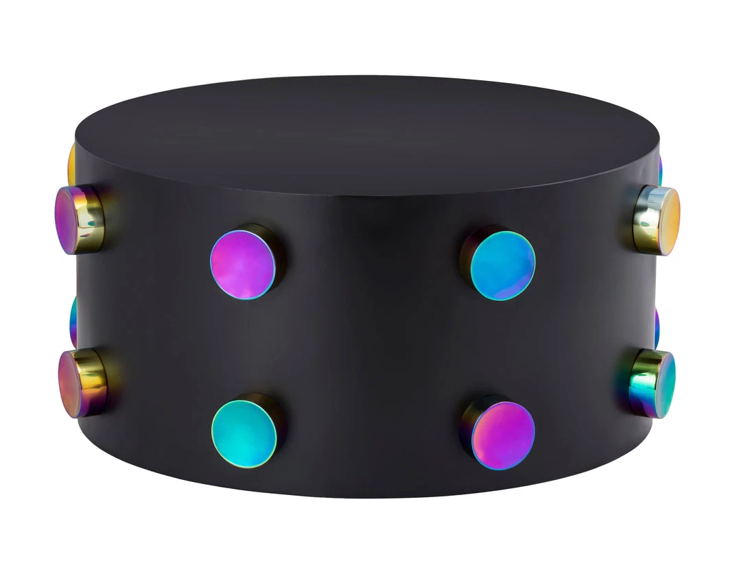 Decorating your space just became a whole lot more exciting! The cylindrical Rockstar table boasts a matte black finish complemented by gold or iridescently colored studs. Available in coffee or side table sizes.
