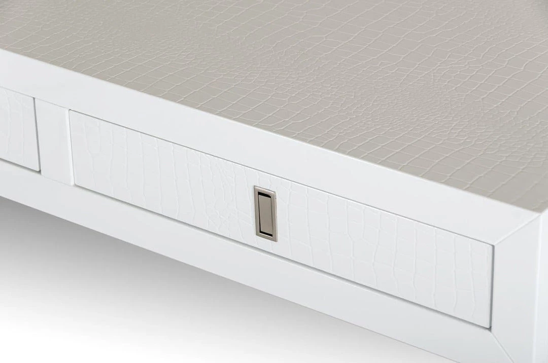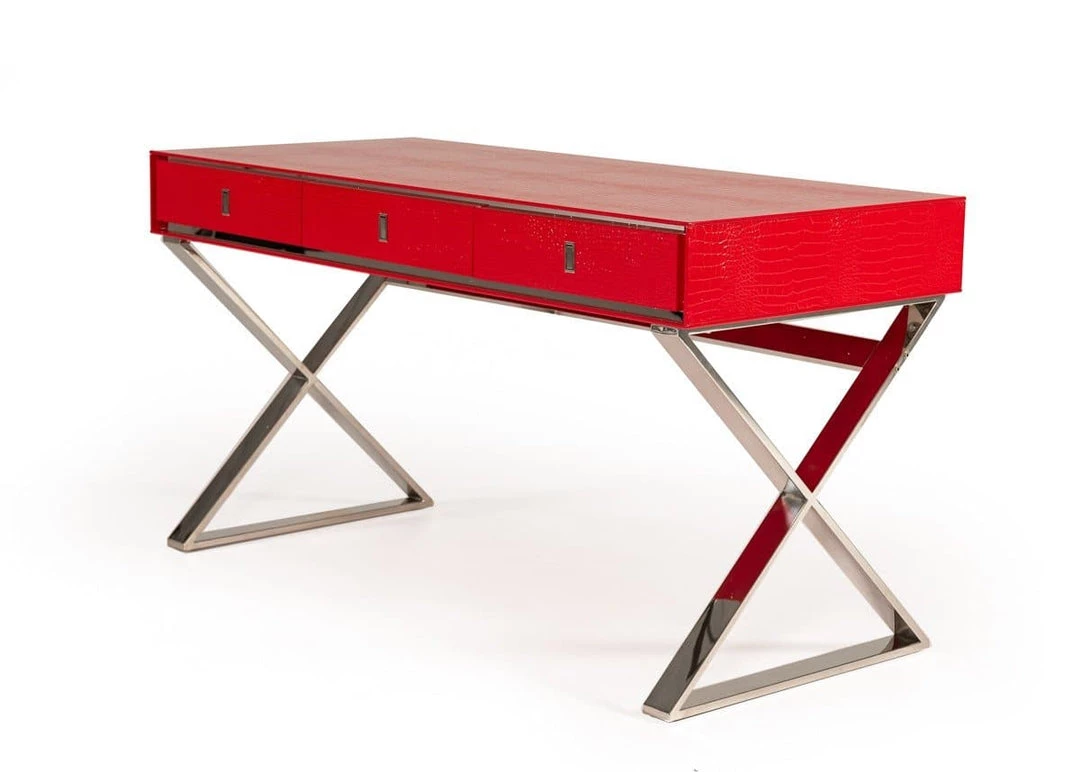 - A detailed laser-cut crocodile textured pattern covers the framework of the Congress desk. The frame is then polished with a rich red lacquer to create a glistening effect. Features three storage drawers and contemporary “X-shaped” stainless steel legs. Matches the A&X Collection. Also available in white and black.