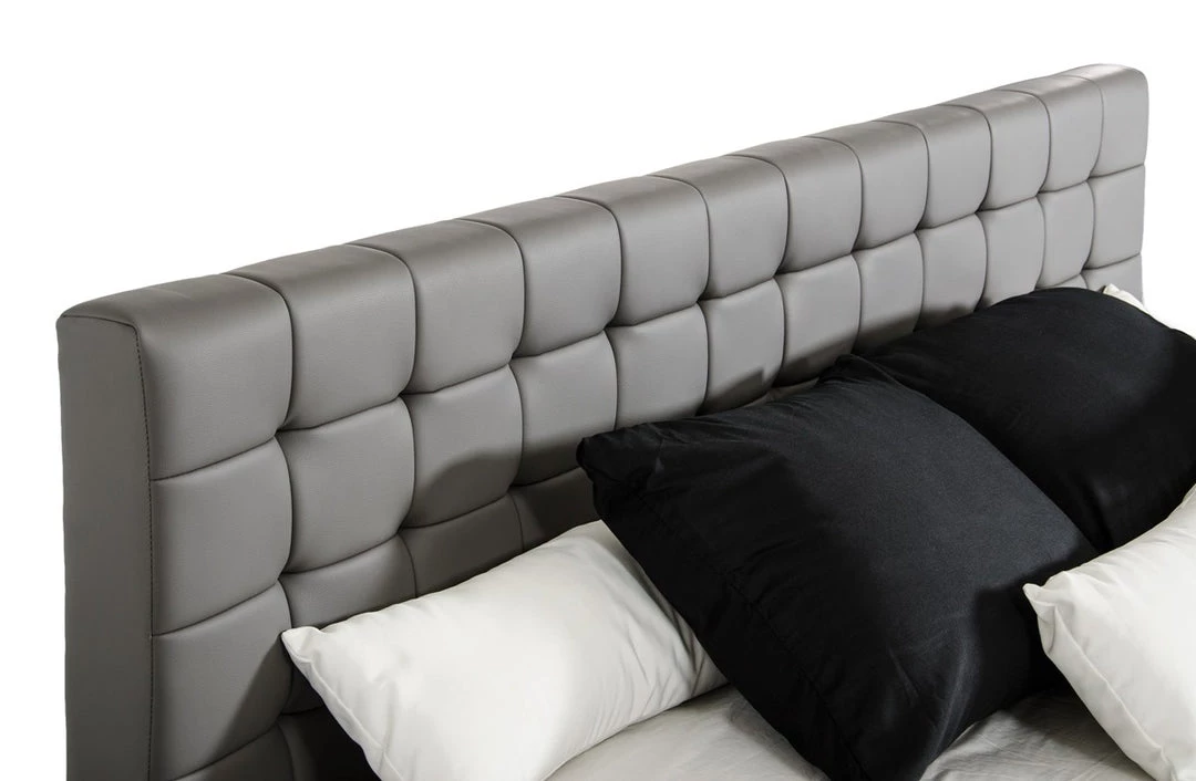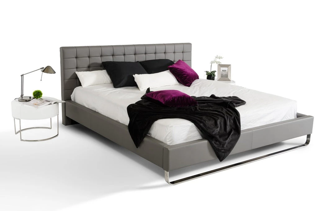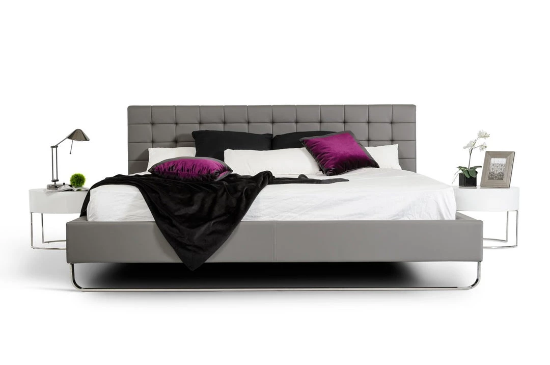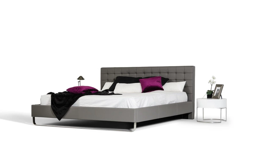 The upholstered grey tufted leatherette headboard provides a soft textured focal point for this composition. Accented by a subtle stainless steel front bar, the Gemma is perfect for any contemporary bedroom. Available in Queen and Eastern King sizes. Assembly is required. Pictured with the Modrest Round White Lacquer Nightstand.