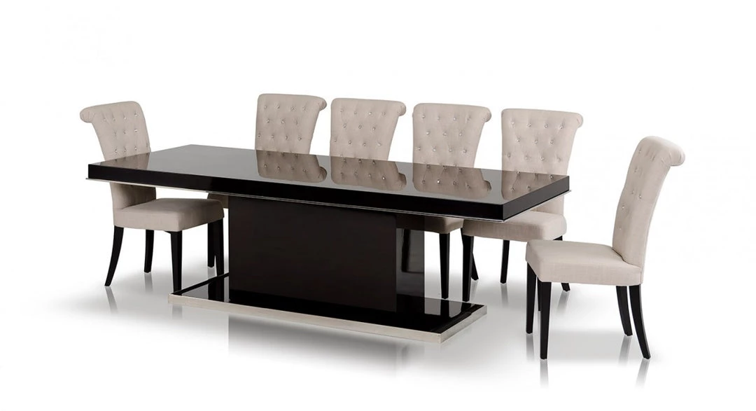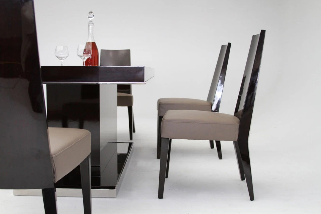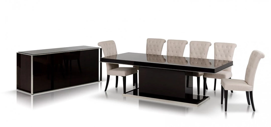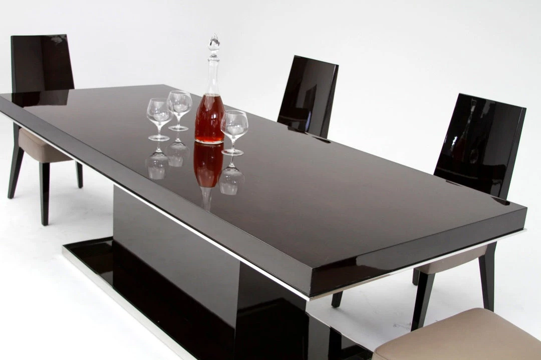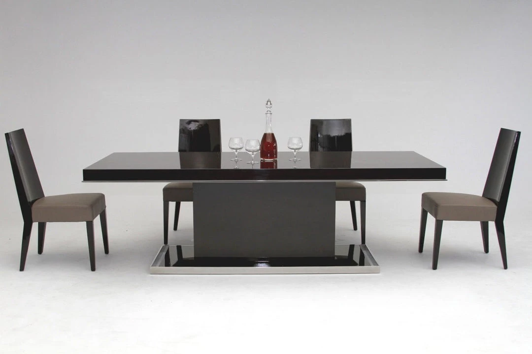 Featuring a glossy ebony lacquer finish accented by stainless steel trim on the tabletop and base, the Noble dining table gleams with perfection. The sleek design makes this table perfect for any home. Pair with the rest of the Noble collection to complete the look.