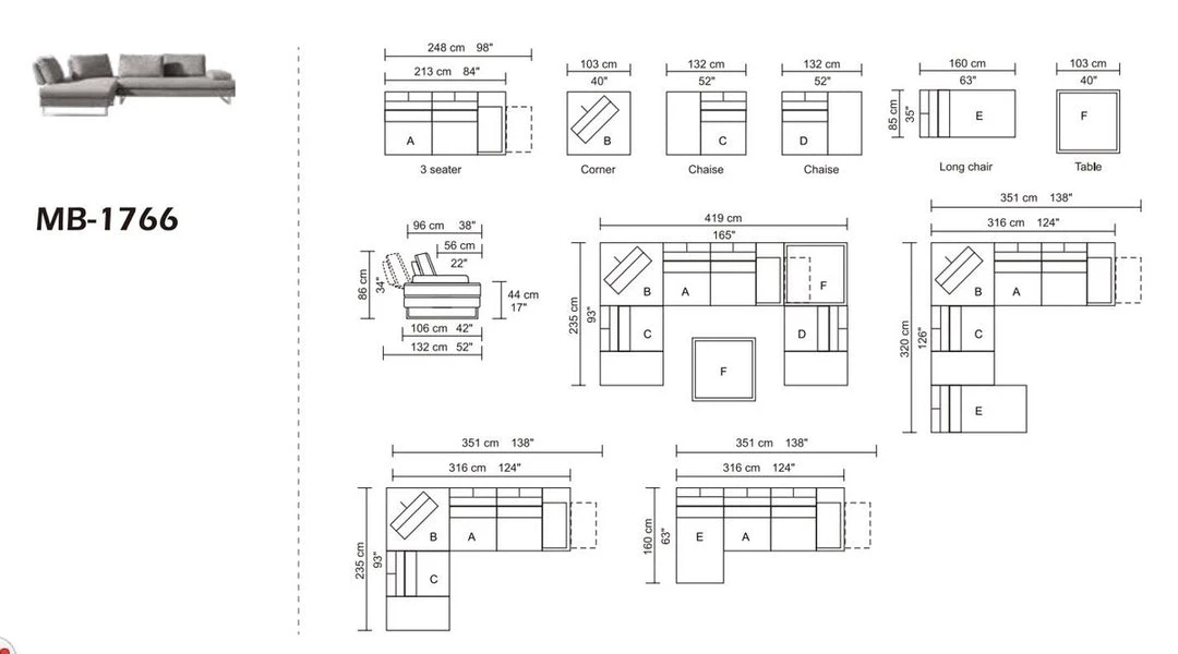 LAF Chaise: W52″ x D42/52″ x H34″