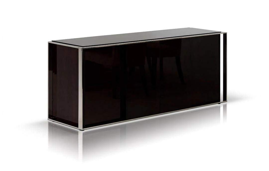 Featuring a rich glossy ebony lacquer finish trimmed with stainless steel highlights, the Noble buffet is a luxurious design. A dark coffee tempered glass top sophisticates the buffet. Pair with the rest of the Noble collection to complete the look. Available in a square buffet. No assembly required.