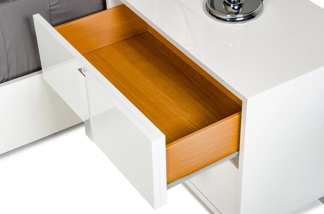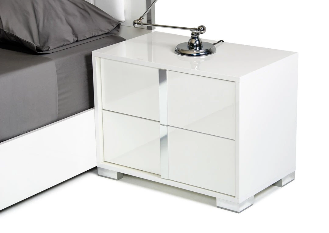 Made in Italy, the San Marino white bedroom set is contrived of the best quality materials and is designed to reinvent your home. The body of the San Marino is finished in a marvelous white gloss lacquer. The eco-leather tufted headboard is trimmed in chrome finish and adorned with LED lights to enhance the focal point. Another popular feature includes a solid melamine wood platform which takes the place of standard slats and creates a sturdier base for the mattress. Designed to enhance both beauty and function, the San Marino features a top of the line self-closing drawer system. The two drawer nightstands and six drawer dresser provide abundant storage and mimic the design of the headboard with the addition of brushed aluminum metal accents. Set includes the bed, two nightstands, dresser, and mirror. Available in Queen and Eastern King sizes. Also available in grey.