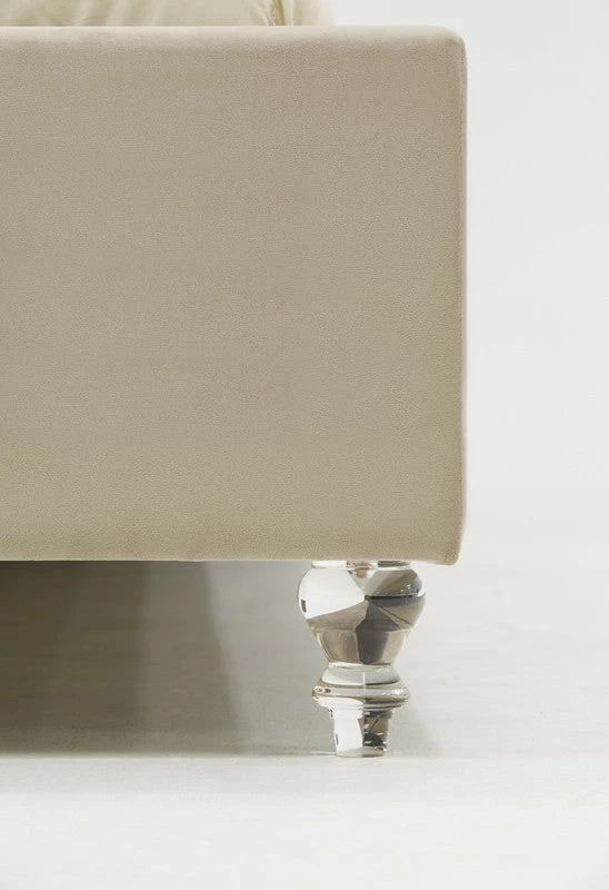 Emanating elegance and luxuriousness is the Modrest Sandra Transitional Light Grey Fabric Bed. Built with a sunken slatted mattress frame, it allows your mattress to breathe for a healthier and cleaner bed. Upholstered in cool light grey fabric, it features a French-inspired plastic crystal button tufted headboard with nail head trims on its border. Completing its enchanting look is the unique cut of the headboard and the art deco clear acrylic legs. These features make this transitional light grey fabric bed contributes to its magical feel and make it stand out from the rest. Get it now and sleep as the royals do!