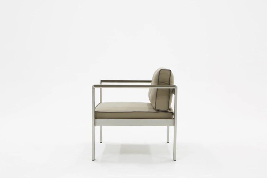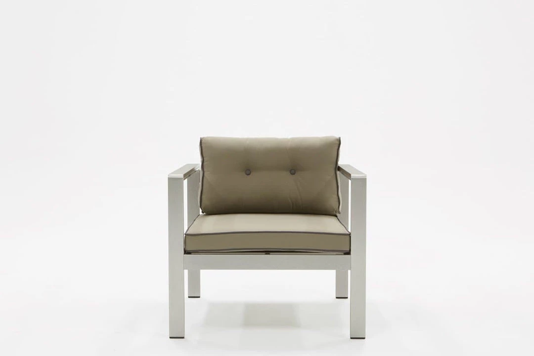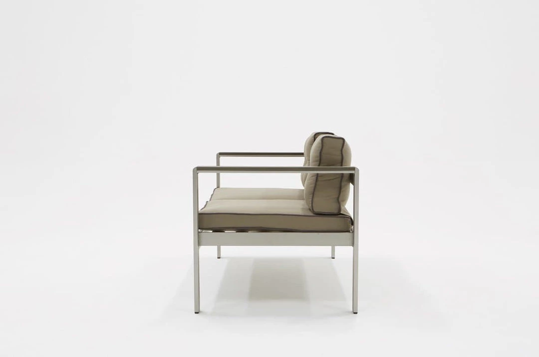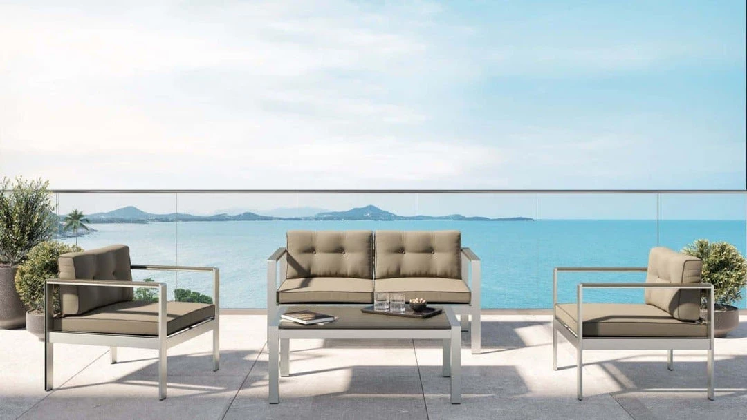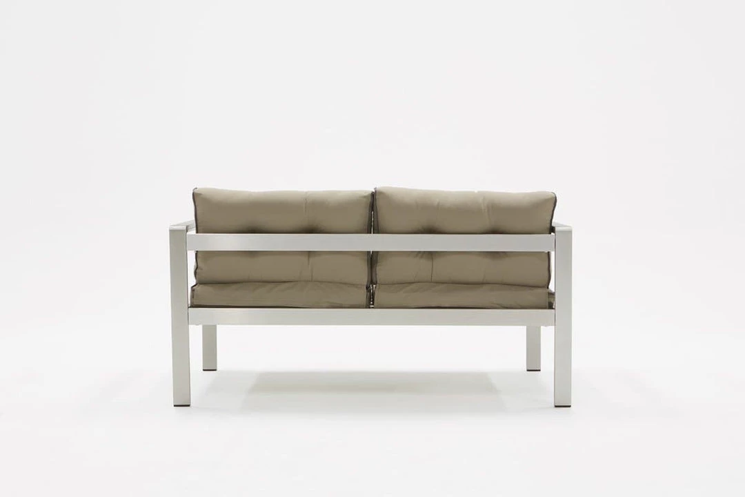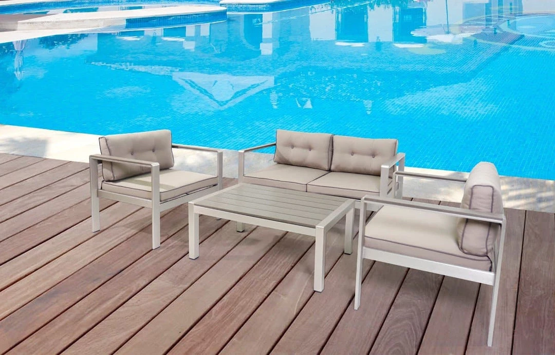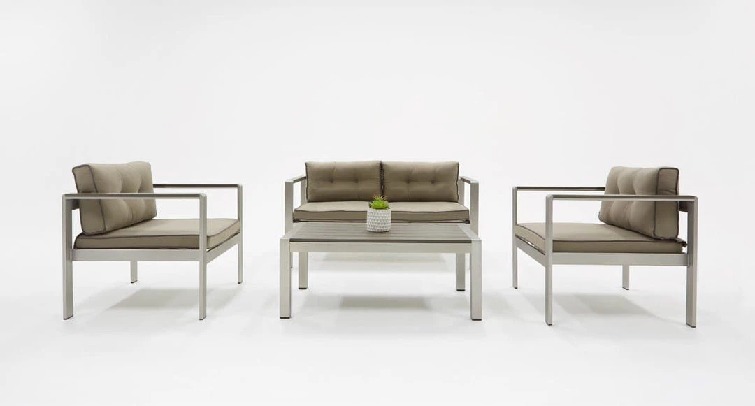 Designed to provide utmost comfort as you unwind outside is the Renava Baja Outdoor Grey Sofa Set. Built with a rectilinear configuration using anodized brushed Aluminum for its frame, it is fitted with 3-inch thick seat and back cushions wrapped in grey weatherproof fabric. To make a statement, dark grey piping adorns the edges of the cushions. Completing this sofa set is a rectangular coffee table with slabs of dark grey Plywood top. There was space between for the wood to breathe and avoid food bits from getting stuck. Foot caps were attached to the legs to prevent this outdoor sofa set from grazing your floor.